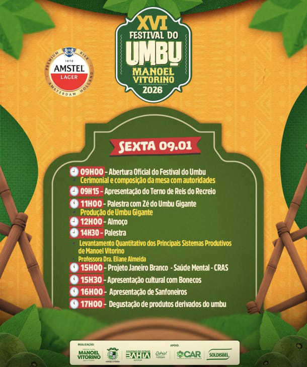 O XVI Festival do Umbu é realizado pela Prefeitura Municipal de Manoel Vitorino, com apoio do Governo do Estado da Bahia, CAR, Solidisbel e demais parceiros institucionais.
