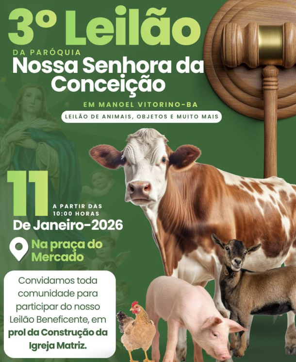 A Paróquia Nossa Senhora da Conceição, em Manoel Vitorino, promoverá no dia 11 de janeiro de 2026 o 3º Leilão Beneficente, um evento tradicional que já faz parte do calendário religioso e social do município. A programação terá início a partir das 10h, na Praça do Mercado, no centro da cidade.