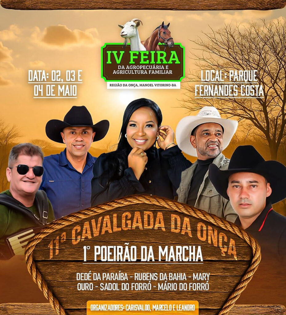 A Região da Onça, no Distrito de Catingal, município de Manoel Vitorino-BA, será palco de um dos eventos mais aguardados do calendário rural: a IV Feira da Agropecuária e Agricultura Familiar, que acontecerá nos dias 02, 03 e 04 de maio, no Parque Fernandes Costa.